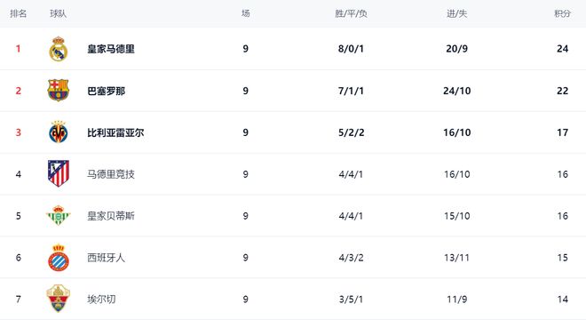 在积分榜上,皇马再次登顶。皇马8胜1负,拿到了24分。巴萨紧随其后,7胜1平1负的战绩,拿到22分。比利亚雷亚尔以17分排名第3。第4的是马竞,4胜4平1负,拿到16分。皇家贝蒂斯也是16分,排名第5。西班牙人以15分排名第6。